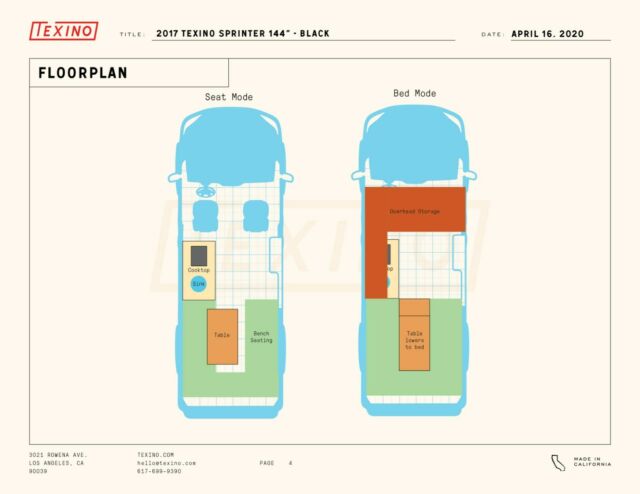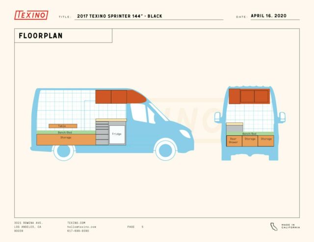 We are Texino, a revolutionary outdoors company based out of Silver Lake, Los Angeles. We focus on matching the highest quality materials with minimalist, modern design. We are selling our beloved Black Sprinter after many wonderful adventures.This van comes complete with everything you'd need for an amazing getaway, whether for a weekend or months on end.Isotherm Fridge FreezerFull size sinkDometic Dual Burner Propane Stove with Exterior Mounted 5lb Propane tank12 gallon fresh water tank and 12 gallon grey water tank.Remote Control MaxxFan with ThermostatWebasto Air and Water heater (powered by diesel; connects to sink and shower)Rear outdoor shower wit privacy curtain175 watt solar panel220 amp hour battery bank30 amp charge controllerWinegard ConnecT 2.0 Wifi Booster (+ 4g LTE with a subscription)RWDSeat 2 Sleep 2 ConfigurationYou can also put this van into our innovative Share Program. In short, we store your van at our shop in Silver Lake, take care of all cleaning, basic maintenance, insurance, and rent it out through our platform. Then we split the profits 50/50. It's great for us because we get another van in our rental fleet and it's great for you to monetize your van's downtime. Here's a link to our FAQ's on the program: texino.com/FAQPlease don't hesitate to reach out with any questions! Also free to chat on the phone or we can set up a video chat tour of the van.